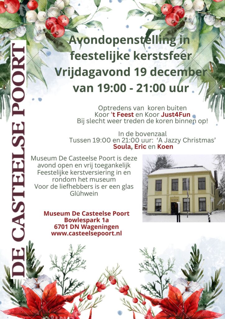 Vrijdagavond 19 december is het Open Huis in het Museum. Een mooie traditie. Tussen 19:00 en 21:00 uur kunt u binnenwandelen, het museum is in kerstsfeer, u kunt de expositie ‘Kunst uit Huis’ bekijken en de expositie ‘Ja Natuurlijk’ van Annemiek Haring en Hetty van de Zande. Deze avond met een muzikale omlijsting. Er treden twee Wageningse koren op: Just4fun en ’t Feest. En het gelegenheidstrio ‘A jazzy Christmas’ met het Wageningse talent zangeres Soula Esveld begeleid door Koen en Eric.